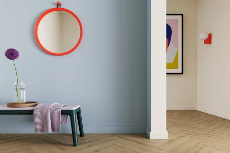 You can finish your Parquetvinyl floor with matching skirting boards in the same look as your floor or with paintable skirting boards. All of our skirting boards are manufactured from water-repellent MDF with a low degree of expansion. Which means you can also use them in your bathroom or kitchen. We have a wide range of overlay skirting boards, low skirting boards and paintable skirting boards – in other words, the perfect finish for every situation.