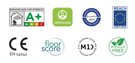 But we also comply with VOC regulations (Belgium), HQE certification (France), AgBb (Germany), M1 (Finland), Indoor Climatic Label (Denmark), BVB and Miljöbyggnad (Sweden), Eco Product (Norway), Nordic Swan (Scandinavia), LEED and WELL (UK).